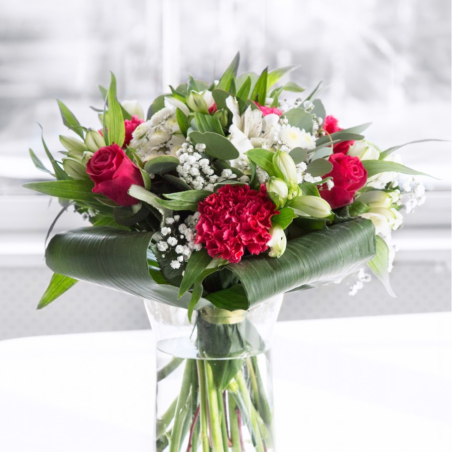 Embrace the splendid grace of our exquisite bouquet. Featuring sweet white chrysanthemums and gypsophila, paired with opulent red roses and delightful carnations, all thoughtfully arranged with white alstroemeria and aspidistra leaves.