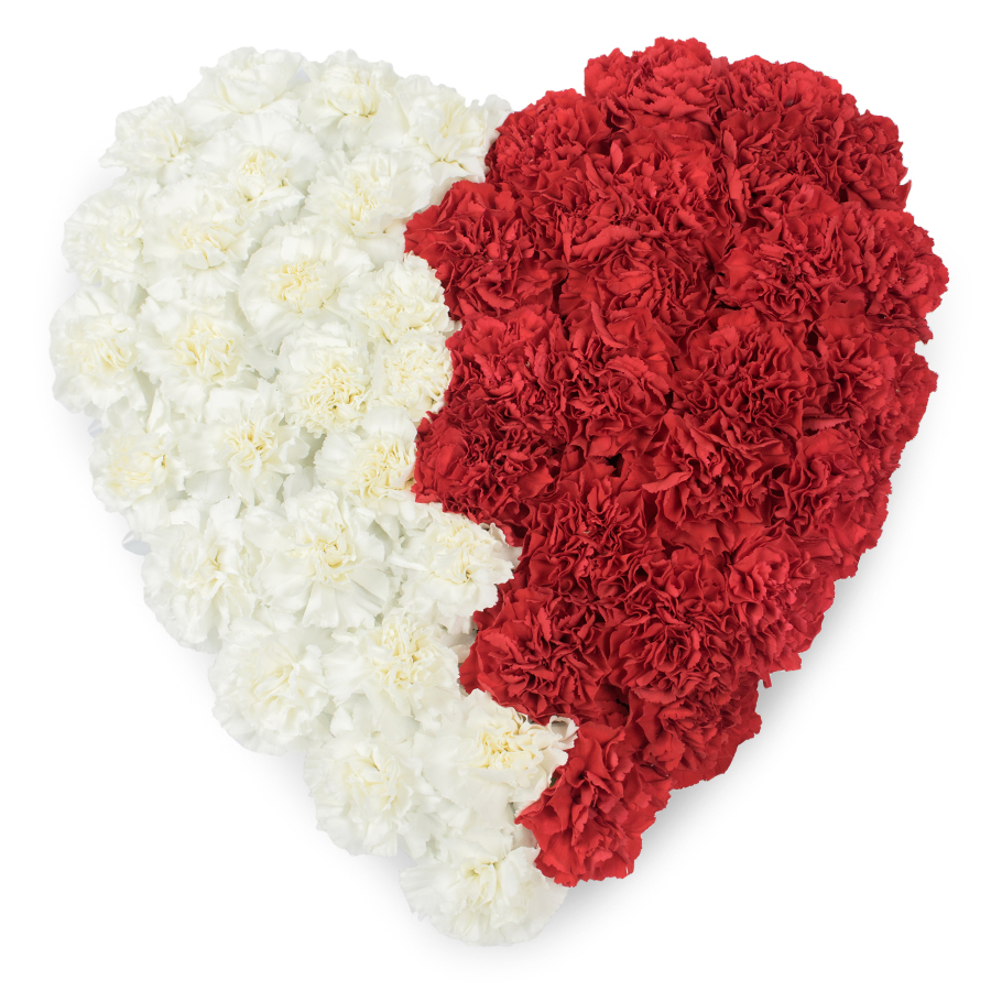 Celebrate love and sympathy with our Handy Flowers Heart-Shaped Carnation Bouquet. This captivating design showcases a harmonious mix of white and red carnations, arranged to form a perfect heart.